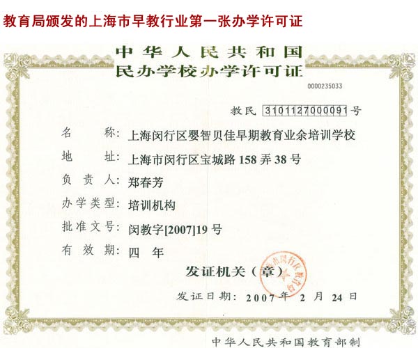 嬰智貝佳作為正規(guī)的早教中心,于2007年2月取得了上海市教育局頒發(fā)的上海市第一張早期教育辦學(xué)許可證,2018年獲得騰訊網(wǎng)“2018年度家長信賴兒童教育品牌”,嬰智貝佳的老師全都具備教師資格及育嬰師資格證書,教育部門有關(guān)專家定期到學(xué)校進行專業(yè)指導(dǎo),教育質(zhì)量得到充分的保證,連續(xù)多年被評為優(yōu)秀民辦早教機構(gòu),所以嬰智貝佳在此特別提醒各位家長:在把您的孩子送去參加早教或有意加盟某家連鎖早教時,一定要其出示教育部門頒發(fā)的辦學(xué)許可證,以免您的利益受到損害。