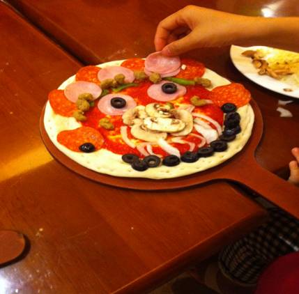哇!DIY神奇動手時間到嘍!寶貝們很興奮又有點激動,這可是我們第一次做好吃的哦,平時大人們都不讓我們接近廚房,怕危險,其實啊,我們可喜歡呢!桌面上每個寶寶都拿到了自己的餅底和餡料,先把番茄醬均勻的涂在餅底上,距離餅邊2. 5厘米,防止涂在餅邊會烤焦,涂完番茄醬以后,寶寶們又把喜歡的餡料均勻的撒在有番茄醬的餅底上了,最后將芝士均勻的覆蓋在披薩上面,有的寶寶家做成了一個大笑臉,有的是一個胖企鵝,有的是太陽花,有的是卷卷頭發(fā)的KFC爺爺……,各具匠心,創(chuàng)意無限!