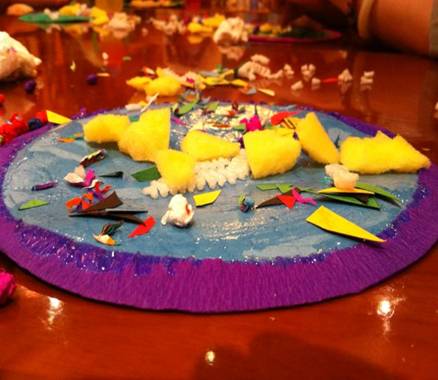 在披薩進爐高溫烘烤過程中,嬰智貝佳的小貝老師帶著寶貝們進行了另一場別開生面的手工游戲----手工紙披薩。只見小貝老師變戲法似的拿出了很多的材料:紙餅胚、彩紙屑、海綿、彩紙團、碎雪花、膠水等,每個家庭都積極地參與到動手游戲中,作品精彩紛呈,場面熱鬧非凡!